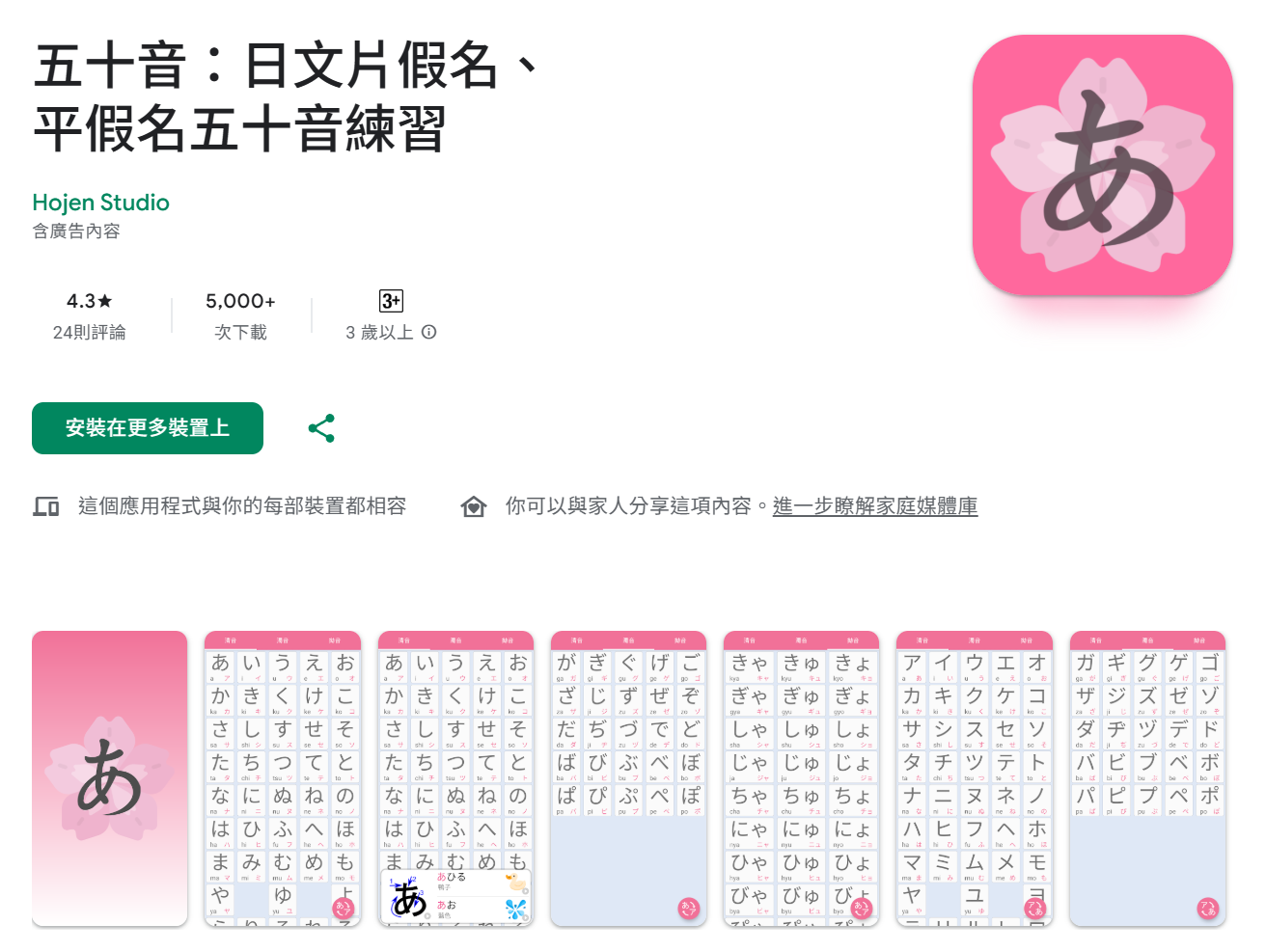 日文五十音練習,包含清音、濁音、拗音,搭配單字快速學習五十音。